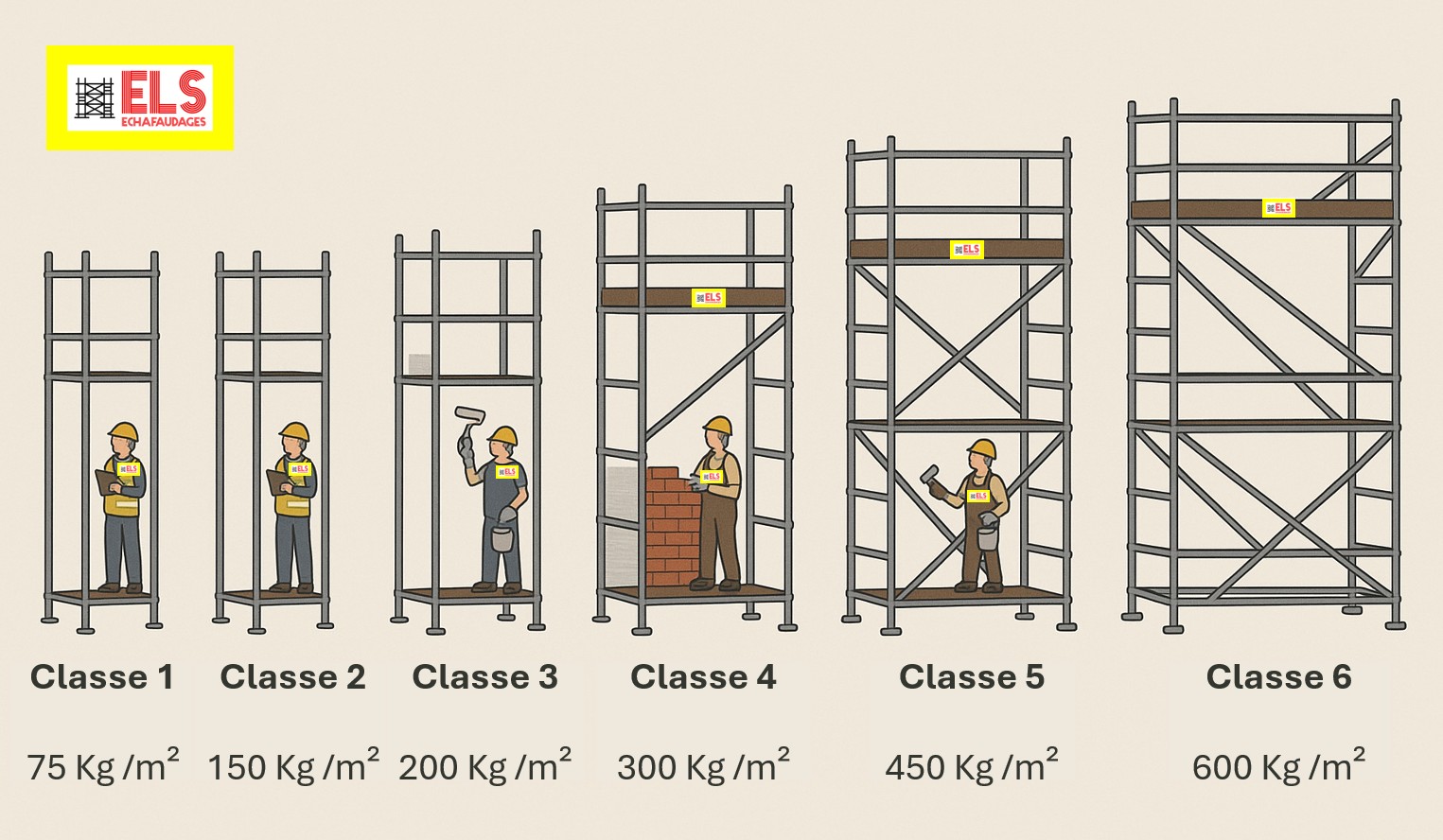 La classe 5 permet une charge admissible allant jusqu’à 450 kg/m². Elle est recommandée pour des travaux de maçonnerie lourde, de pose de pierre, ou d’autres opérations nécessitant le stockage de volumes importants de matériaux. Une structure renforcée est nécessaire pour garantir la stabilité de l’échafaudage sous cette charge.
